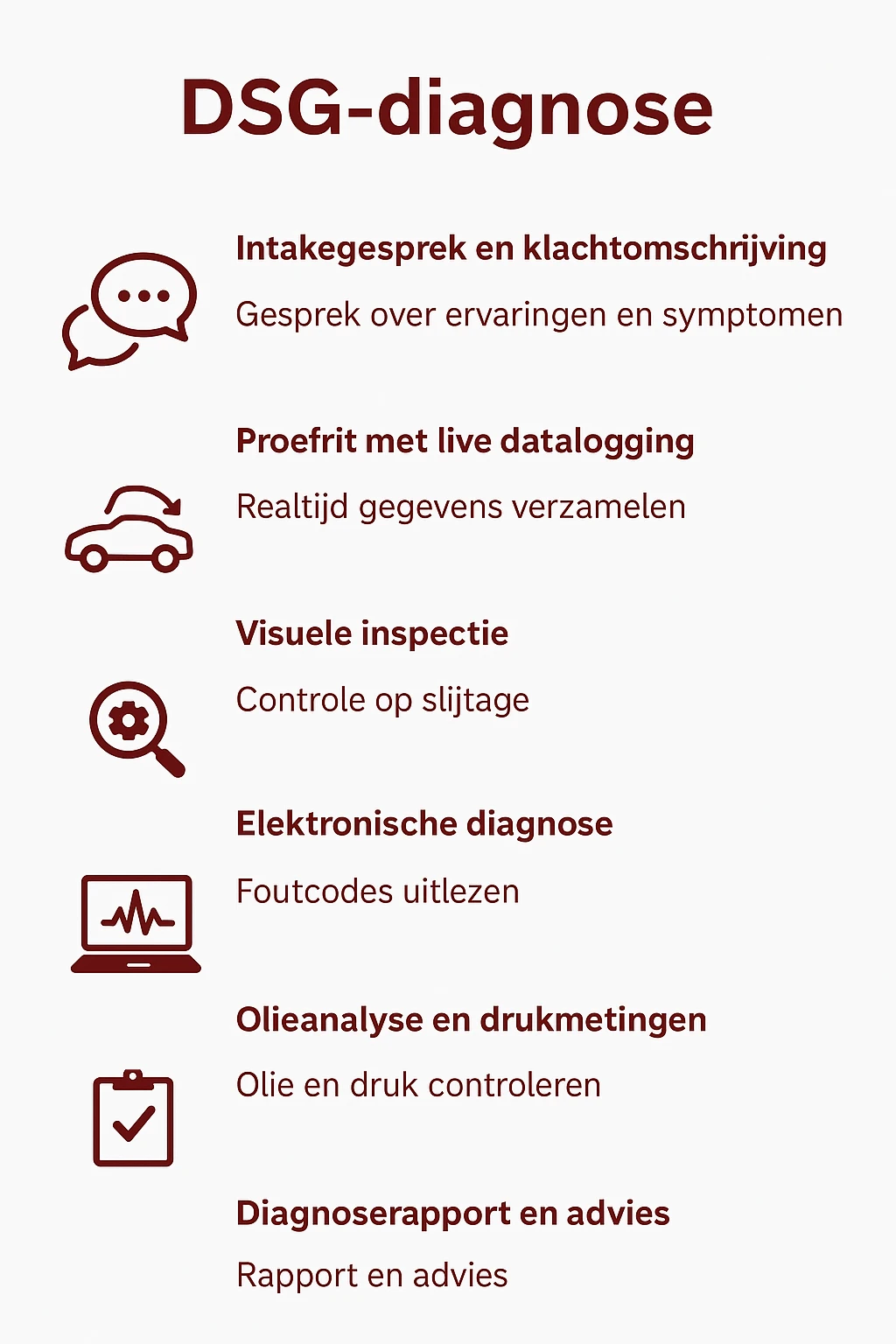 Een DSG-diagnose is meer dan alleen het uitlezen van foutcodes. Het is een zorgvuldig proces waarbij we samen met jou het probleem in kaart brengen en gericht naar de oorzaak zoeken. Zo zorgen we ervoor dat we niet alleen het symptoom aanpakken, maar het onderliggende probleem oplossen.